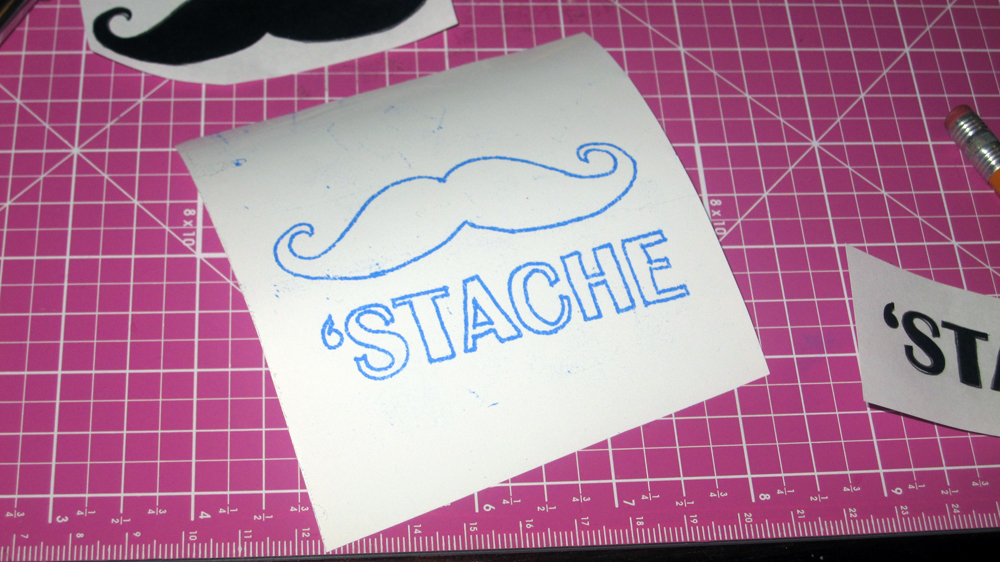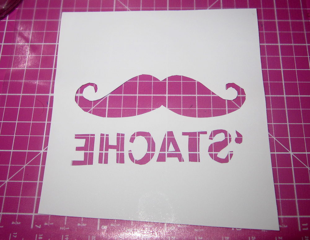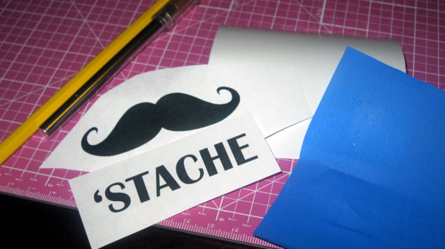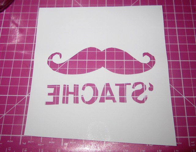 For a negative design, remove the cut outs carefully from the vinyl and discard.  (So for example, in our photos, the mustache and the word “‘stache” would get pulled out leaving everything else around it.)  For a positive design, do the opposite!  Pull off the background, leaving only your positive design stuck to the paper backing.  And if you’re feeling really tricky, you can actually use both pieces if you want a “his and hers” / “positive and negative” / “yin and yang” thing.  Regardless, just remember that anywhere the vinyl is NOT and the etching cream is will in fact get etched.